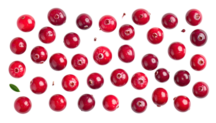 Overhead shot of numerous ripe, red cranberries scattered against a plain, black background