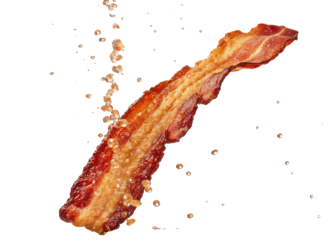 Delicious single strip of crispy fried bacon. Savory pork meat food sprinkled with salty seasoning, an appetizing isolated breakfast