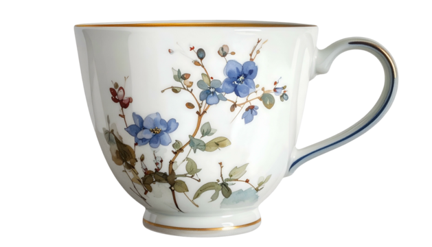 Ceramic cup with floral design, blue flowers, gold trim, white