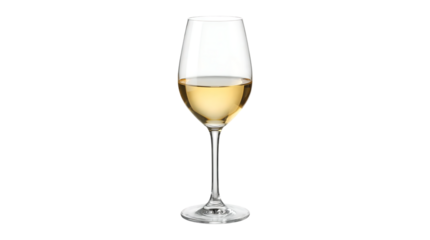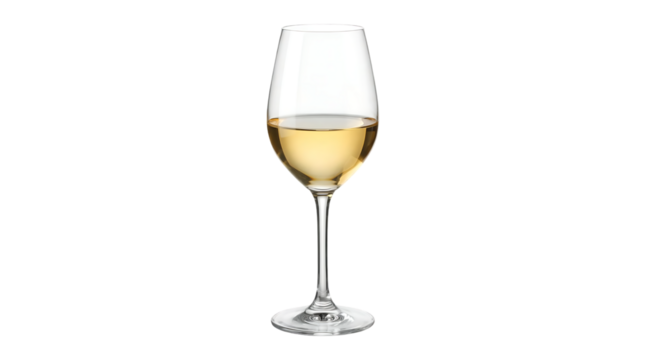 A solitary glass of pale yellow wine stands prominently against a stark black background highlighting its elegant form and inviting color