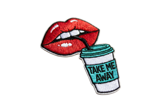 Red lips sipping coffee in takeaway cup with bold typography in hand drawn style for cafe branding