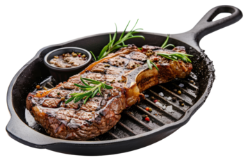 Grilled Steak: A mouthwatering juicy steak on a hot iron skillet, with char marks and sizzling sauce.
