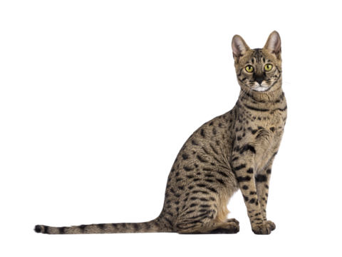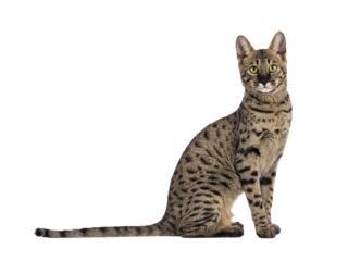 Savannah F4 cat with loads of serval resemblance, sitting up side ways. Looking straight into camera. Isolated cutout on a transparent background.