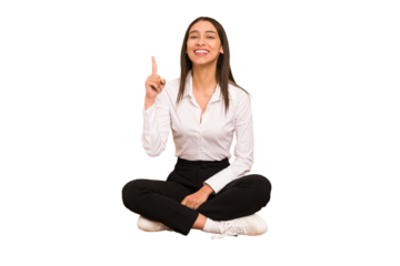 Young colombian woman sitting on the floor isolated showing number one with finger.