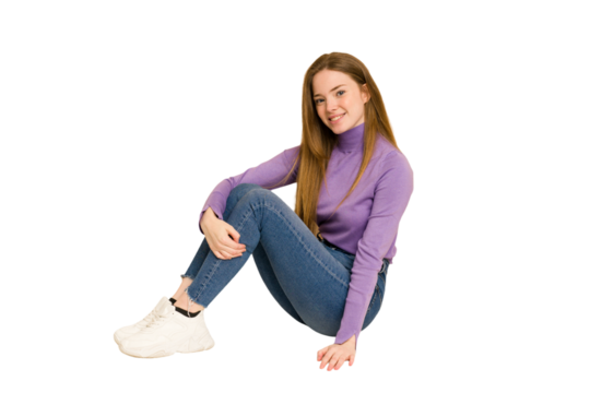 Smiling woman in business casual sitting on luxurious sofa transparent