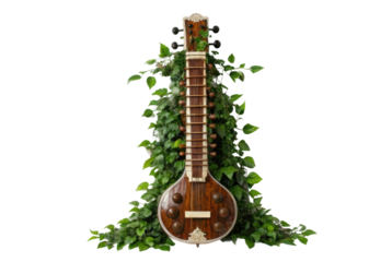 PNG Traditional indian sitar with green foliage on black background