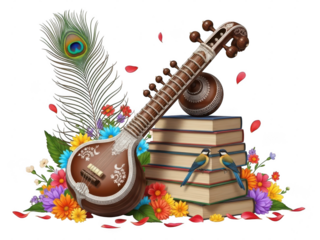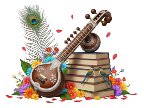 Decorative sitar with peacock feather, books, flowers, and birds isolated on transparent background