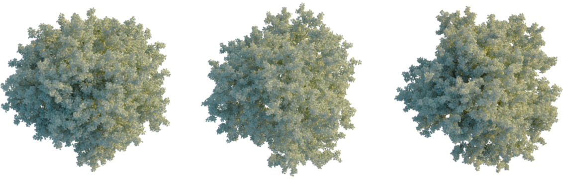 Sorbus aria tree plan, top view, cutout, transparent background, isolate, Three deciduous trees in full white bloom viewed from above on transparent background