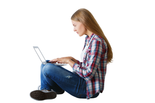A college or a university girl student studying and browsing on the laptop and completing the assignments while sitting on the floor isolated on a PNG background.