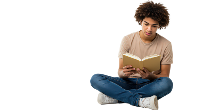 Young man with afro hair sitting cross legged on the floor reading a book isolated on transparent background