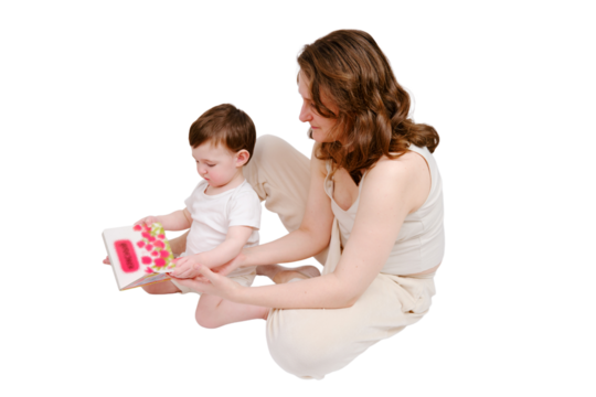 Happy baby with mother reading a book on studio, isolated on white background. Portrait of a smiling child with mom, isolated on white background. Kid about two years old (one year nine months)