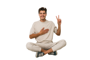 Young caucasian man sitting on the floor isolated on white background taking an oath, putting hand on chest.