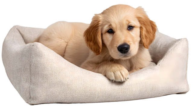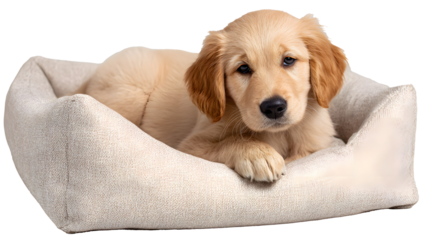 Adorable golden retriever puppy resting comfortably in a beige pet bed on a white background