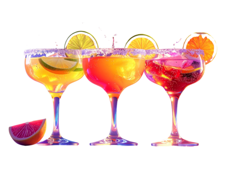 Collection of Six Glass Bottles Filled with Fresh Sangria with Fruit Slices on White Background