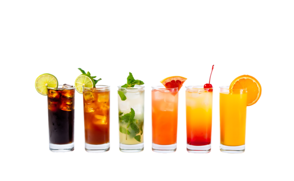 Six assorted cocktails in various glasses with garnishes, isolated on transparent background