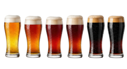Six distinct beer glasses with lager, amber ale, red ale, and dark stouts, foam, and condensation on a transparent isolated background with copy space, concept for beverage advertising