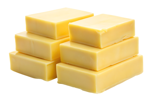 Stack of six yellow cheese cubes on white background isolated on a transparent background dairy