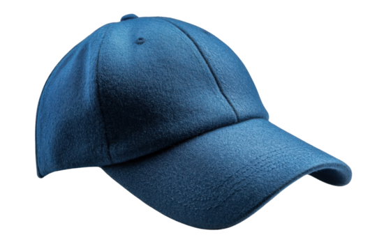 A classic six-panel baseball cap in a textured blue fabric is presented on a transparent background.