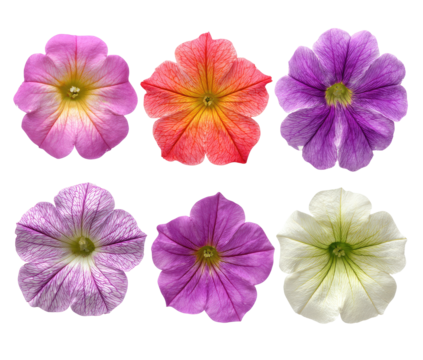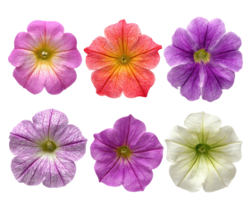 Close-up view of six petunia flowers, various colors