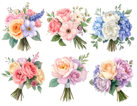 Six watercolor floral bouquets with varying pastel colors