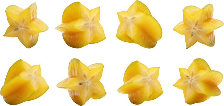 Sliced star fruit pieces arranged in various orientations showcasing yellow star shaped tropical fruit with visible seeds and texture on a clean surface