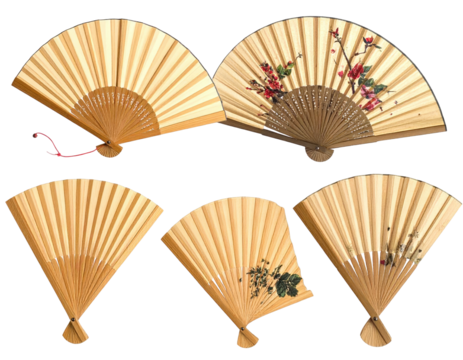 Six handcrafted paper fans, light beige color with floral designs