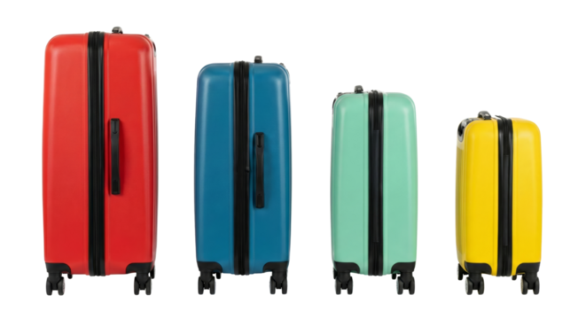 Four colorful suitcases in different sizes on a white background