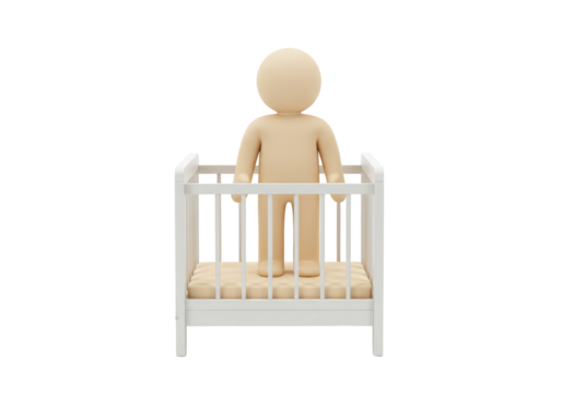 Isolated figure standing in a child's crib, baby bed, showing scale, nursery room