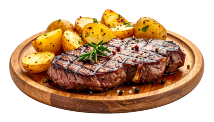 Grilled steak and roasted potatoes served on a wooden plate, close-up with a black background