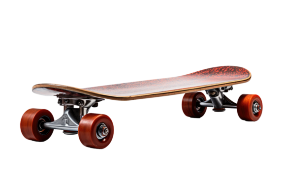 Skateboard With Wheels. The skateboard features a deck, trucks, and wheels, ready for use or display. on a White or Clear Surface PNG Transparent Background.