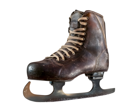Vintage brown leather ice skate with worn laces and metal blade isolated on transparent background