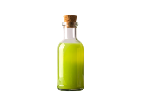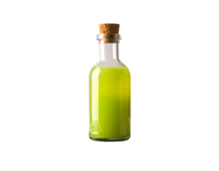A clear glass bottle filled with a glowing green liquid sits prominently
