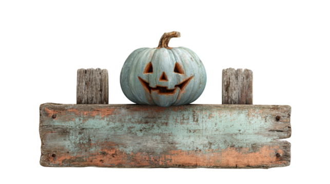 Jack O'Lantern Peeking Out From Behind Old Weathered Sign isolated on a white background