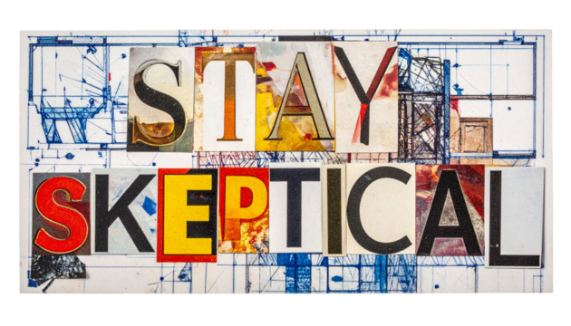 Stay Skeptical" message formed with cut-out letters on a blueprint