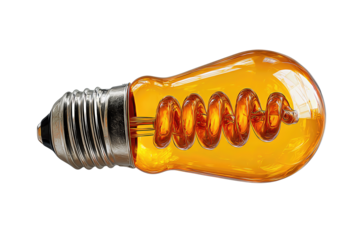 Vintage-style glass bulb with glowing amber filament and textured nickel socket, skewed dynamically for depth and realism, isolated on transparent background.