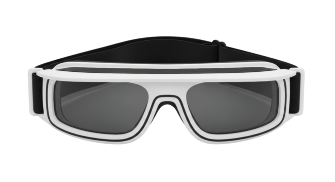 Isolated white ski goggles with dark lenses and adjustable black strap, active equipment