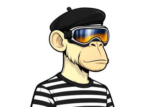 Ape avatar profile in striped shirt, ski goggles, and black beret on solid black background. NFT style illustration.