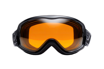 Silver framed ski and snowboard goggles with amber orange lens and soft foam padding for winter sports protection, Isolated on Transparent and White Background