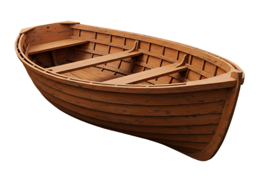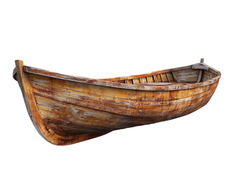 Aged wooden rowboat resting on transparent backdrop, displaying vintage nautical charm with weathered texture and worn details