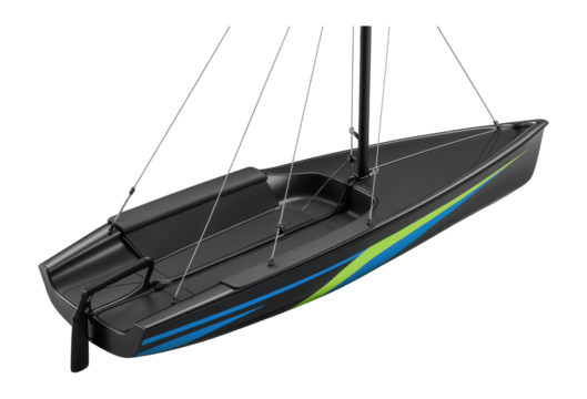 High-performance skiff with a trapeze system and vibrant hull graphics