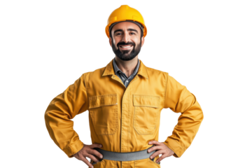 Smiling bearded construction worker wearing white hard hat and light colored work jacket arms crossed isolated on transparent background