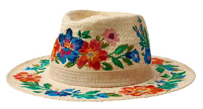 Straw Hat with Colorful Floral Embroidery isolated on a transparent background