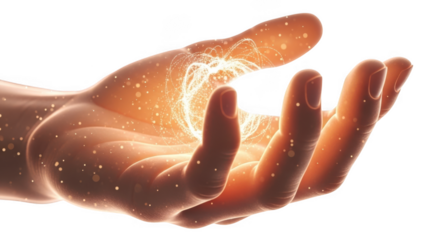 Hand holding glowing light isolated on transparent background, concept of power
