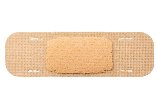A neutral toned beige adhesive bandage with a pale square gauze pad PNG cutout transparent background isolate