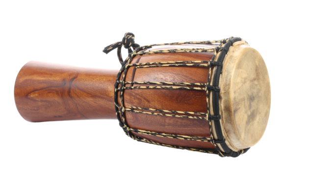 Djembe drum showing its handcrafted details, featuring a wooden body, sturdy ropes, and an animal skin head, transparent background