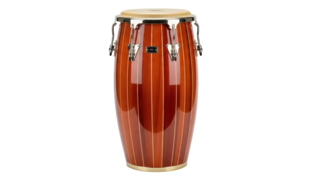 Wooden conga drum isolated PNG, percussion instrument with metal hardware and natural skin head for Latin music and rhythm
