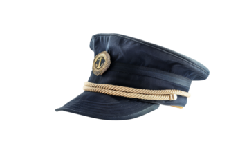Isolated navy-blue captain's hat with gold rope trim, nautical apparel for boating and sailing