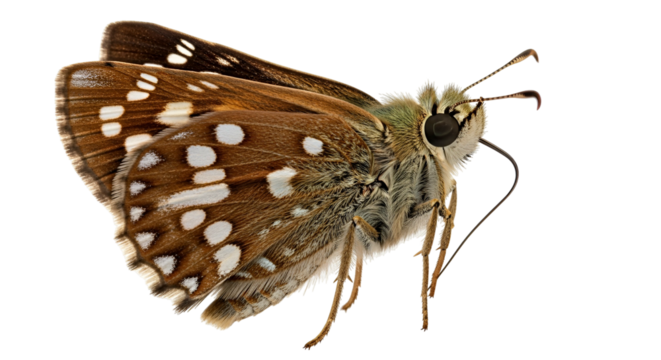 Profile view of a beautiful brown skipper butterfly with intricate white spots on its wings, isolated on a clean white background