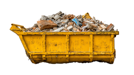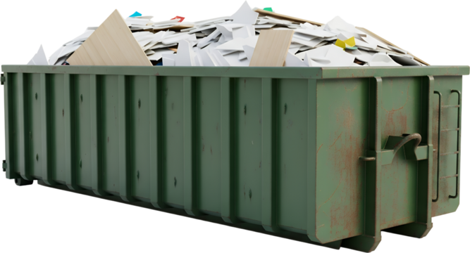 A large green rusty metal dumpster filled to capacity with construction debris including plasterboard wood scraps and colored paper