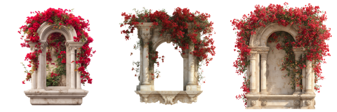 Set of Weathered stone arch surrounded by vibrant red blooms and fresh green foliage highlighting a window on transparent png background. Ai generated